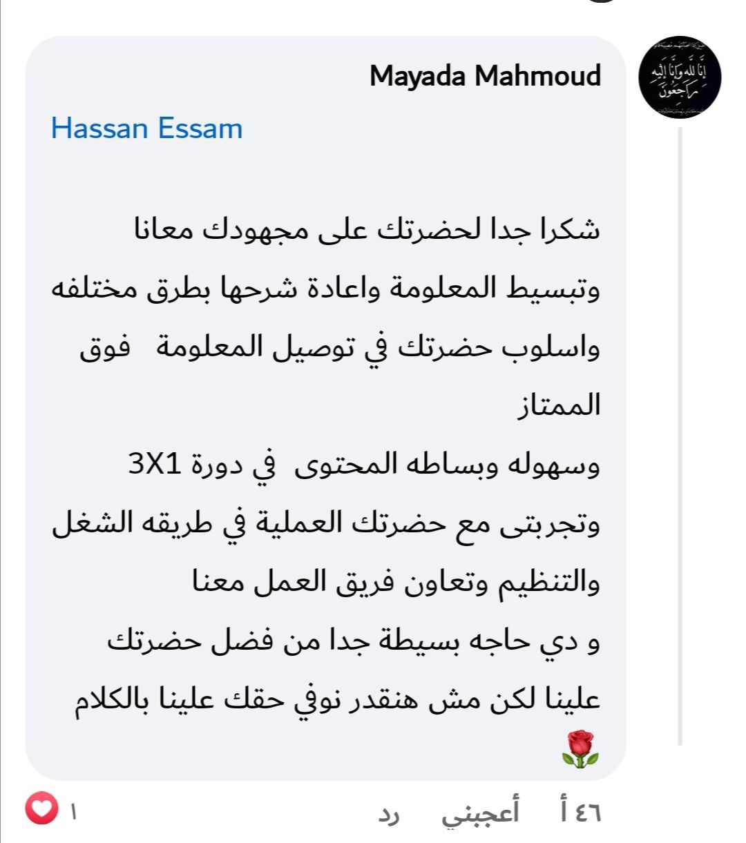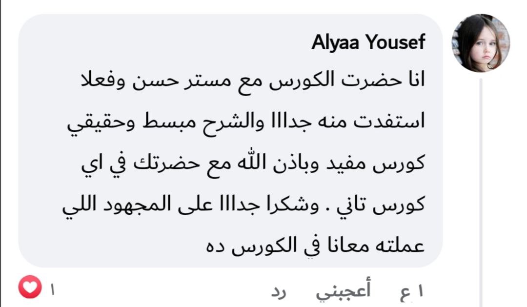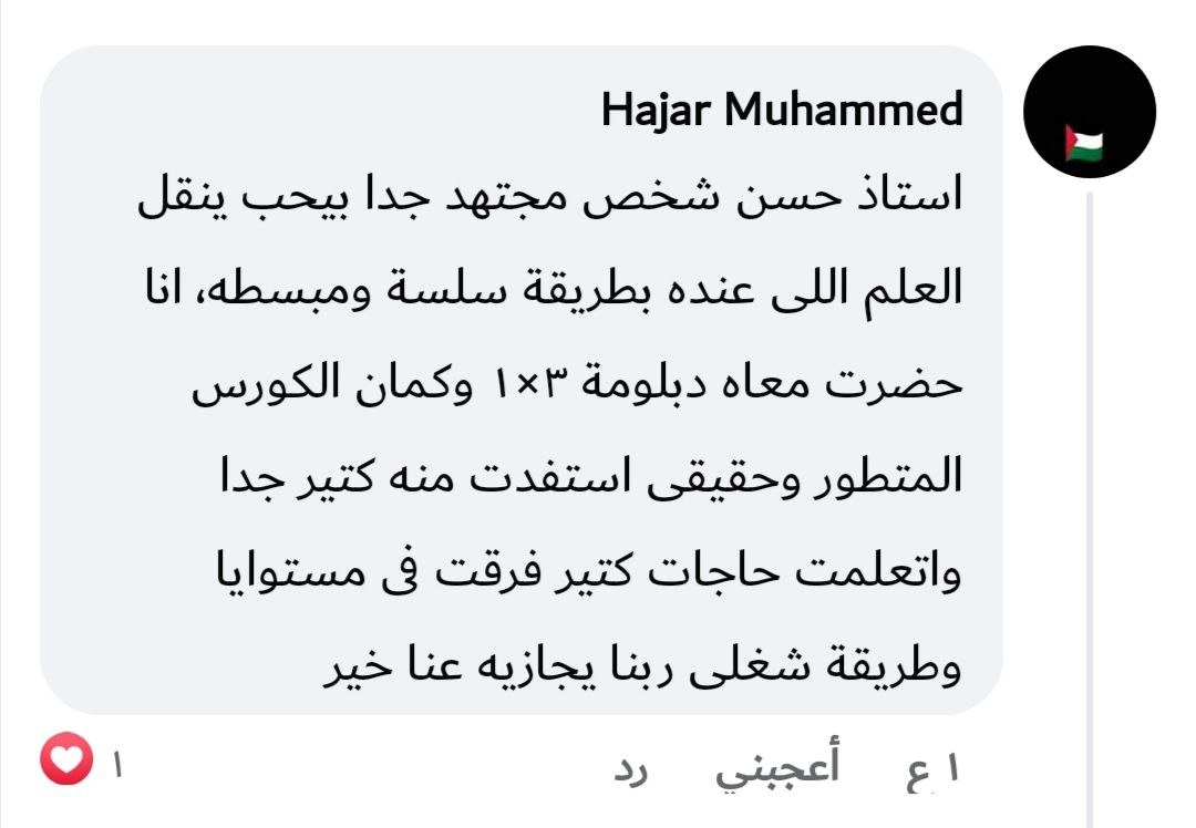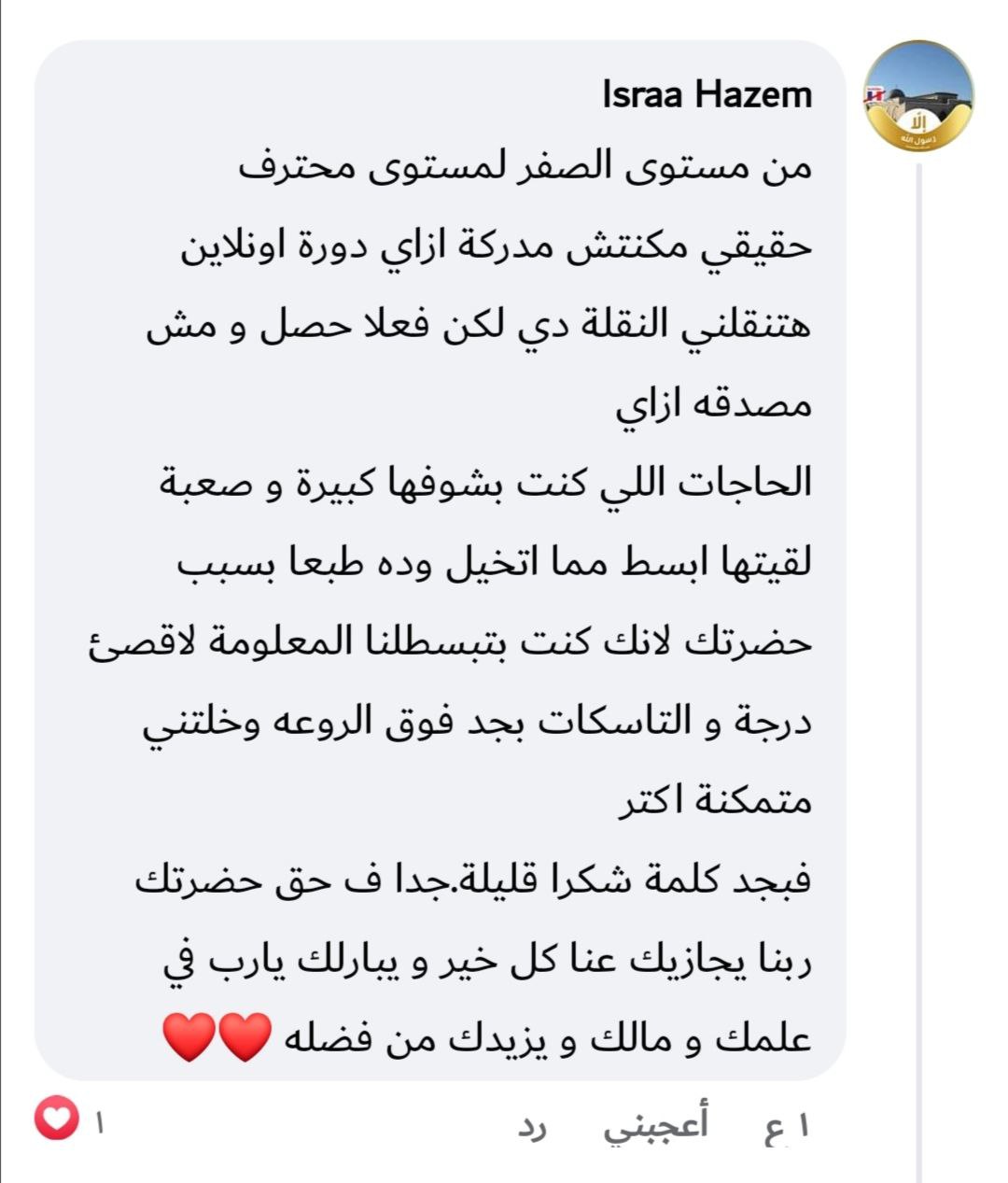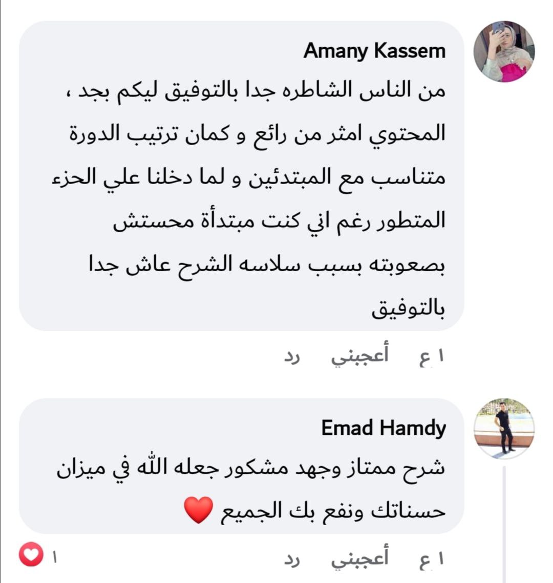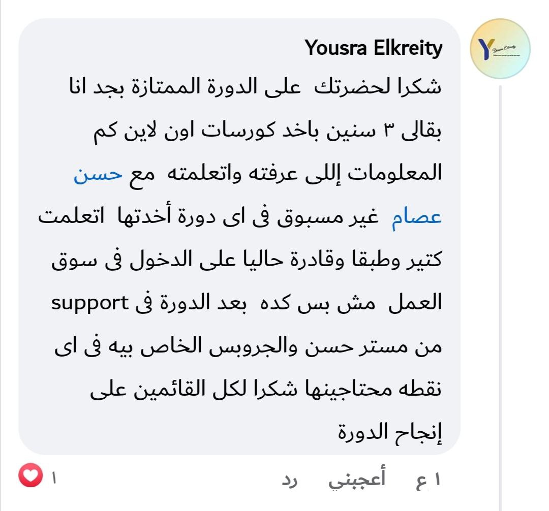 في جروب دعم ومتابعة لفترة بعد نهاية المسار تقدر تسأل فيه وتشارك تطبيقاتك، وبعض الناس اللي هتثبت نفسها بيكون ليها فرص زيادة (تدريب عملي / شغل / ترشيحات).