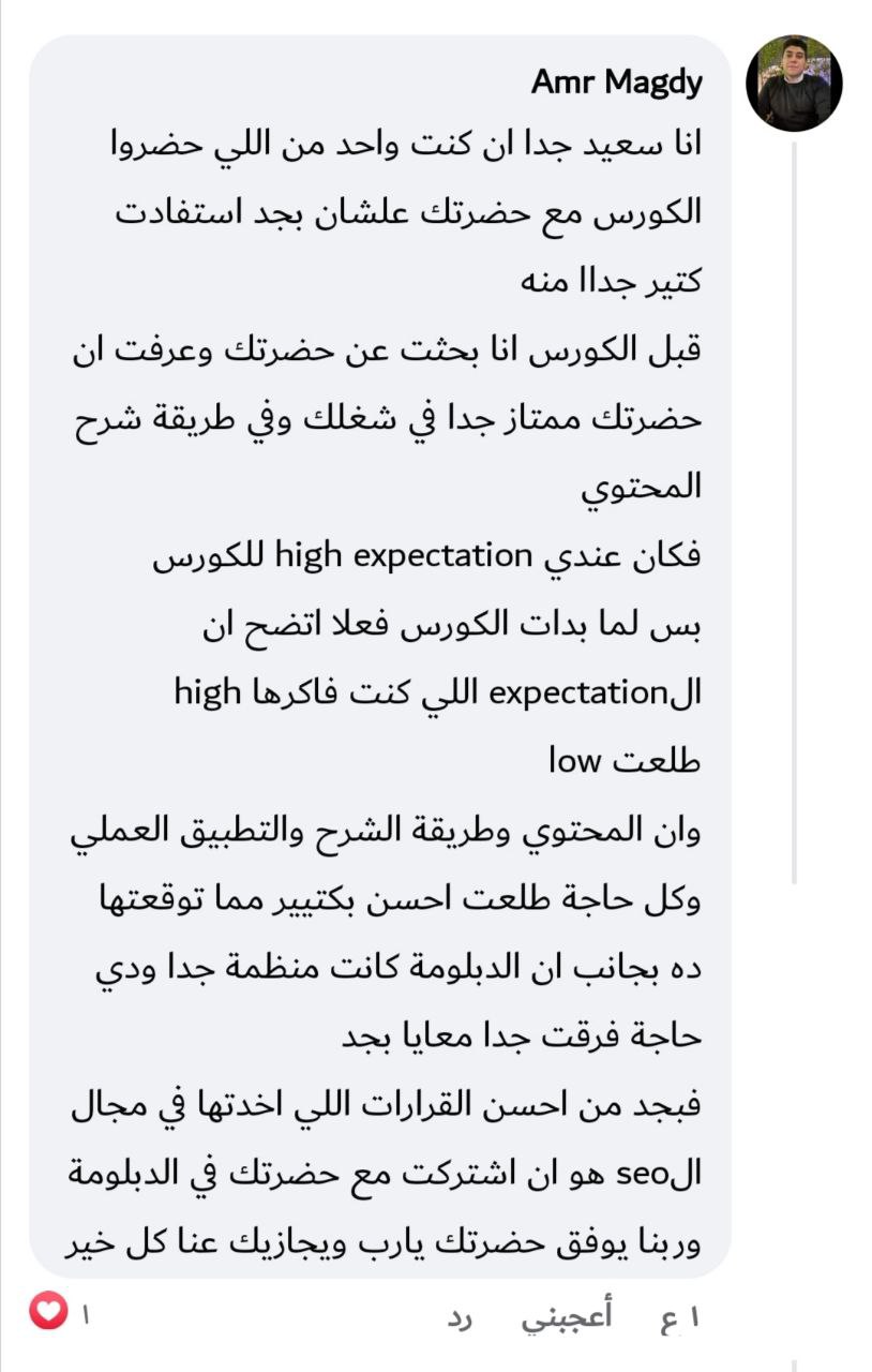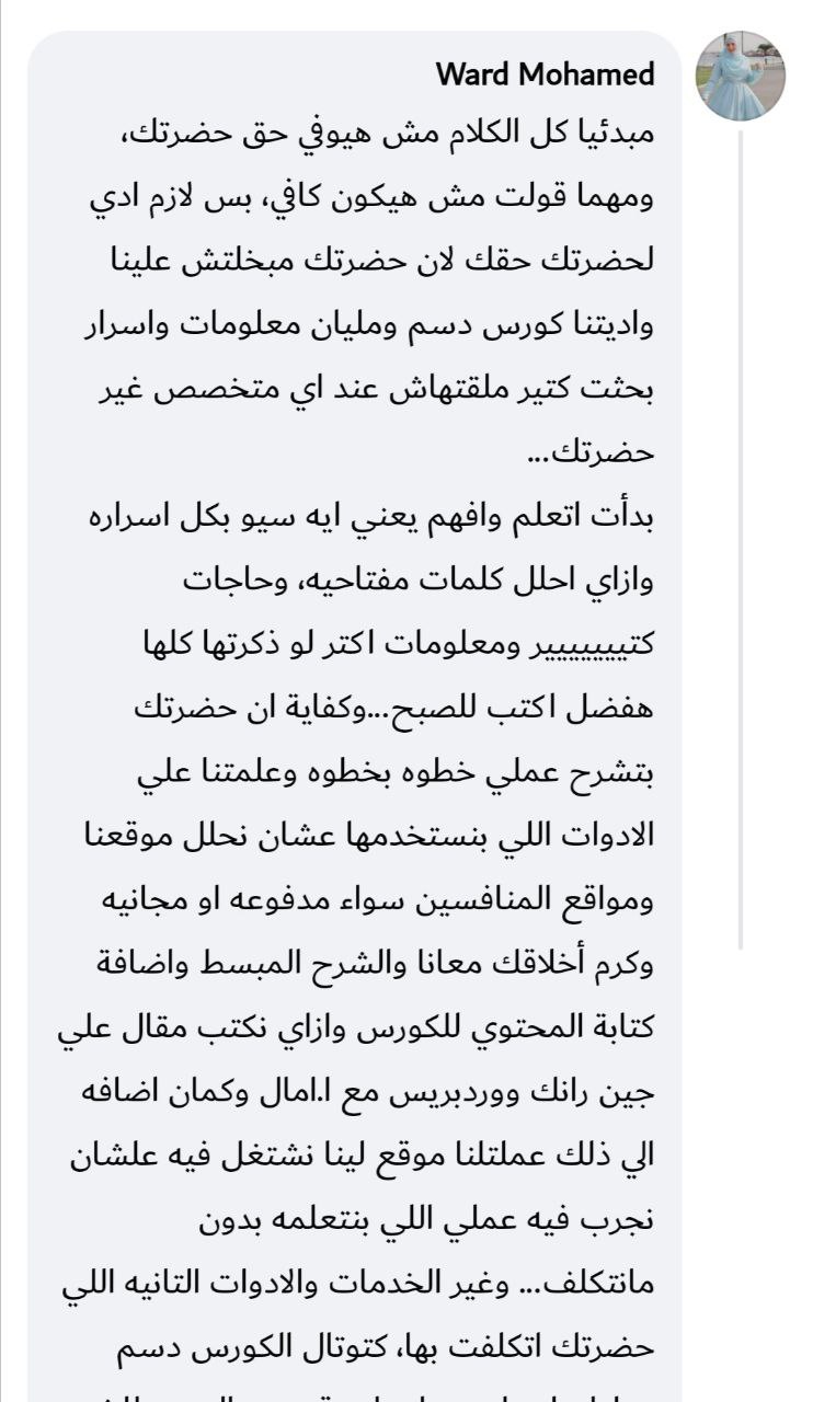 الخلاصة: بعد المسار دا تقدر تمسك موقع أو متجر حقيقي وتشتغل عليه من A to Z — من البحث والتحليل، لحد الخطة، التنفيذ، والنتايج الفعلية.